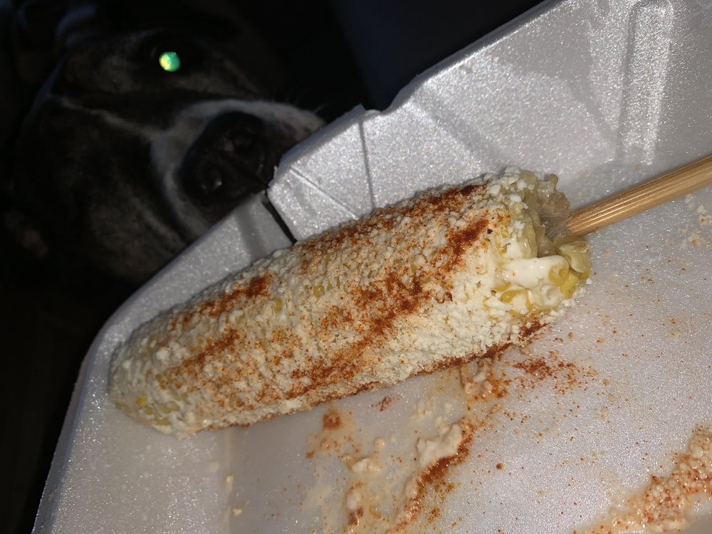 DELICIOUS CORN ON THE COB WITH MAYO, QUIJOTE CHEESE, CHILI POWDERED.