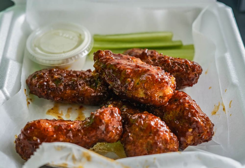 WINGS INCLUDE CELERY AND INCLUDES (1) 2oz CHOICE OF BLUE CHEESE OR RANCH. **PLEASE NOTE: ANY EXTRA DRESSING AFTER THE QUANTITY GIVEN WITH YOUR OPTION OF WINGS WILL BE 50 CENTS MORE.**6 WINGS ONLY GET ONE SAUCE CHOICE**** ALSO NO OPTION OF ALL FLATS OR THIGHS**